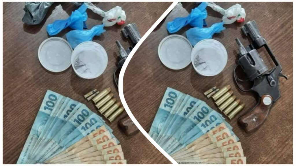 Ao chegarem na residência indicada, foram encontradas duas munições calibre .22 intactas e uma caixa de som de procedência duvidosa. Na casa ao lado, foi encontrado um revólver calibre .38 sem numeração legível, mais cinco munições intactas, um frasco contendo uma substância aparentando ser cocaína, vários sacos geralmente utilizados para o embalo de drogas, além da quantia de 1.360 reais em cédulas.