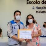 Secretário da Sedur, Luiz Felipe Aragão, e diretor-presidente do Iepetec, Francineudo Costa, entregam certificado à aluna Ana Cristina Cerqueira. Foto: José Caminha/Secom