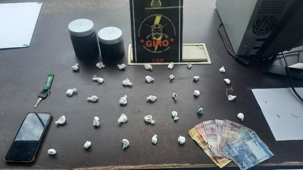 Após a revista pessoal nos suspeitos o GIRO encontrou próximo aos agentes 2 potes contendo 17 trouxinhas aparentando ser cocaína e 15 trouxinhas aparentando ser pasta base de cocaína, além de R$ 65 reais.