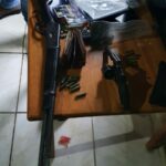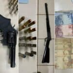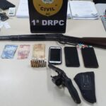 Durante as buscas os investigadores encontraram e apreenderam no quarto do nacional F. P. do C. 02 (duas) armas de fogo em baixo da cama, sendo um revólver calibre .38 oxidado, municiado com 06 (seis) munições intactas e um rifle modelo Puma calibre .38 preto; mais 09 (nove) munições calibre .38 intactas em um gaveta do guarda-roupas; um coldre de arma em tecido Neopreme; R$ 570,00 (quinhentos e setenta reais); 03 (três) celulares, sendo um Samsung Galax A20 vermelho, um Samsung Galax J5 branco e um celular LG LM K420; aproximadamente 2 kg de carne de animal silvestre salgada que estava armazenada em um balde plástico.