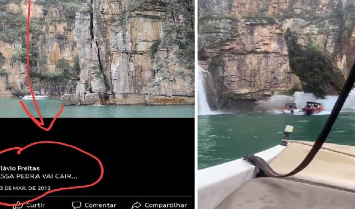 Uma foto está viralizando na internet após um cânion desabar em cima de três embarcações. Um homem identificado como Flávio Freitas postou uma foto a cerca de 10 anos atrás no local em que a rocha caiu. Na legenda da publicação, o homem disse que a pedra iria cair. “Essa pedra vai cair”, escreveu Flávio.