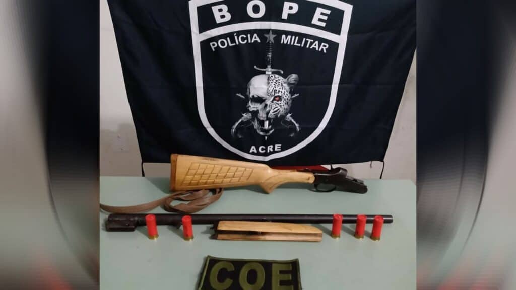 Durante cumprimento da Operação Hórus, do Programa Vigia, uma guarnição do Batalhão de Operações Especiais (BOPE), da Polícia Militar do Acre (PMAC), apreendeu no município de Acrelândia uma arma de fogo tipo “espingarda”, com munições. A Operação foi realizada no início da noite deste sábado, 19, e tinha como principal foco interceptar veículos roubados que seriam levados para a Bolívia.