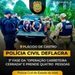Na manhã deste sábado, 5, a Polícia Civil a terceira fase da deflagrou operação “Carreteira Cerrada” de cumprimento de mandados de busca e apreensão a capturou quatro pessoas envolvidas em crimes de tráfico de drogas, integrar o organização criminosa e porte ilegal de arma de fogo e roubo de caminhonetes.
