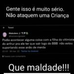 “Podia acontecer alguma coisa com a filha do Arthur para ele ter que sair logo do BBB”. Na sequência, ele diz não suportar mais ver Arthur na casa mais vigiada do Brasil: “Eu não estou suportando esse anão de merd*”.