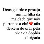 “Gente, isso é muito sério. Não ataquem uma criança! Que maldade! Que deus possa preencher o coração dessa moça de amor, para que ela possa se sentir tão amada ao ponta de transbordar o que não tem. Deus guarde e proteja minha filha da maldade que não pertence a ela! Não deixem de orar pela vida da Sophia. Obrigada”, escreveu.