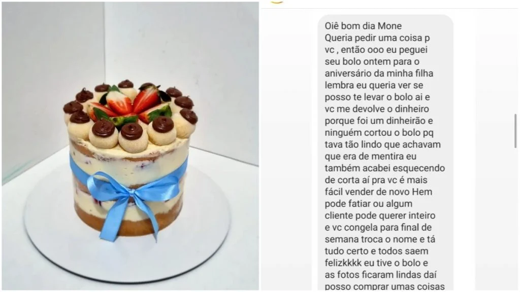 “Oie, bom dia, Mone. Queria pedir uma coisa pra você. Então, eu peguei seu bolo ontem para o aniversário da minha filha, lembra? Eu queria ver se posso te levar o bolo aí e você me devolve o dinheiro. Porque foi um dinheirão e ninguém cortou o bolo porque tava tão lindo que achavam que era de mentira”, escreveu a cliente.