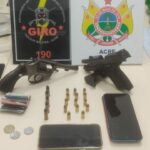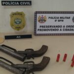 No municipio de Senador Guiomard (Quinari), as Forças de Segurança da cidade desarticularam uma reunião do crime organizado e conseguiram apreender um revólver calibre 38, outra arma de fabricação caseira, além do cano e cabo de três espingardas e material utilizado para montagem delas.