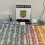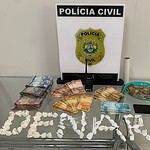 Foram apreendidos na residência do suspeito: 29 invólucros plásticos de substância entorpecente do tipo oxidado de cocaína, pesando 145g; 52 invólucros plásticos de substância entorpecente do tipo cocaína, pesando 260g; 01 veículo Ford Fiesta cor vermelha; R$ 2.328,90 em espécie e 01 rádio comunicador.