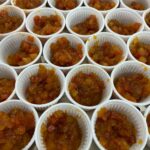 No preparo, os cuidados são redobrados. Luvas, toucas, máscaras são itens indispensáveis assim como o capricho das cozinheiras que não abrem mão dos temperos que todo mundo gosta.