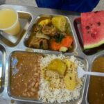 Nos pratos tem o básico e nutritivo feijão com arroz e a proteína varia entre carne, frango ou peixe preparados de formas diferentes. Também tem macarrão, salada com legumes e verduras e a farofa de todo dia do acreano.