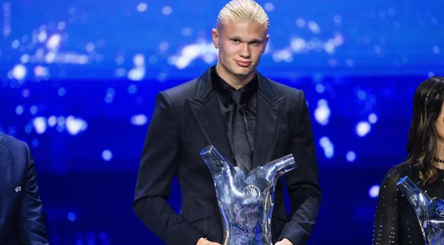 Atacante do Manchester City-ING, Erling Haaland foi eleito pela UEFA o melhor jogador da temporada de 2022/2023. O craque recebeu o prêmio nesta quinta-feira (31), em evento no Forum Grimaldi, na cidade de Mônaco. Campeão e artilheiro da Champions League, ele superou Lionel Messi, do Inter Miami-EUA, e Kevin De Bruyne, companheiro de City.