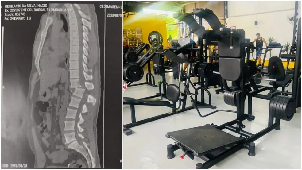 O exame na coluna de Regilâneo da Silva Inácio, homem de 42 anos atingido por um aparelho em uma academia de ginástica no Ceará, mostra a lesão na coluna, que ficou deslocada. Ele foi atingido por uma máquina chamada “hack squat”, usada para fazer agachamento convencional. O acidente causou uma lesão na coluna considerada gravíssima por médicos.