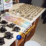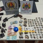 Foi feito a revista e em posse de Lucas dentro do balde foi encontrado 122 trouxinhas de cocaína, 96 pacotes menores de skank, 11 pacotes grandes de skank, 2 aparelhos celulares, 2 documentos de identidade, 1 revólver calibre 38 com três munições e uma quantia de R$ 692,00 reais possivelmente oriundo das vendas dos entorpecentes.