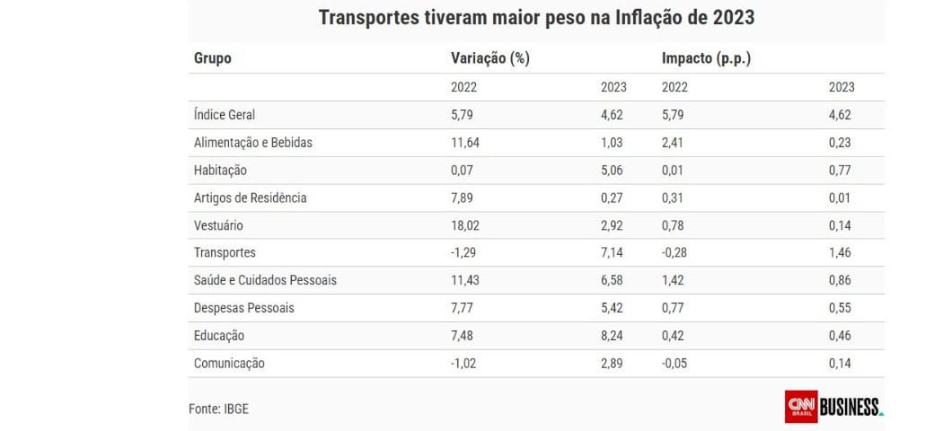 Do lado das quedas, o destaque fica para automóveis novos (2,37%), cujos preços desaceleraram em relação a 2022 (8,19%), enquanto os dos usados recuaram 4,80%.