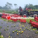 A carga que o caminhão transportava ficou espalhada na rodovia e o trânsito de veículos no local não tem previsão de liberação.