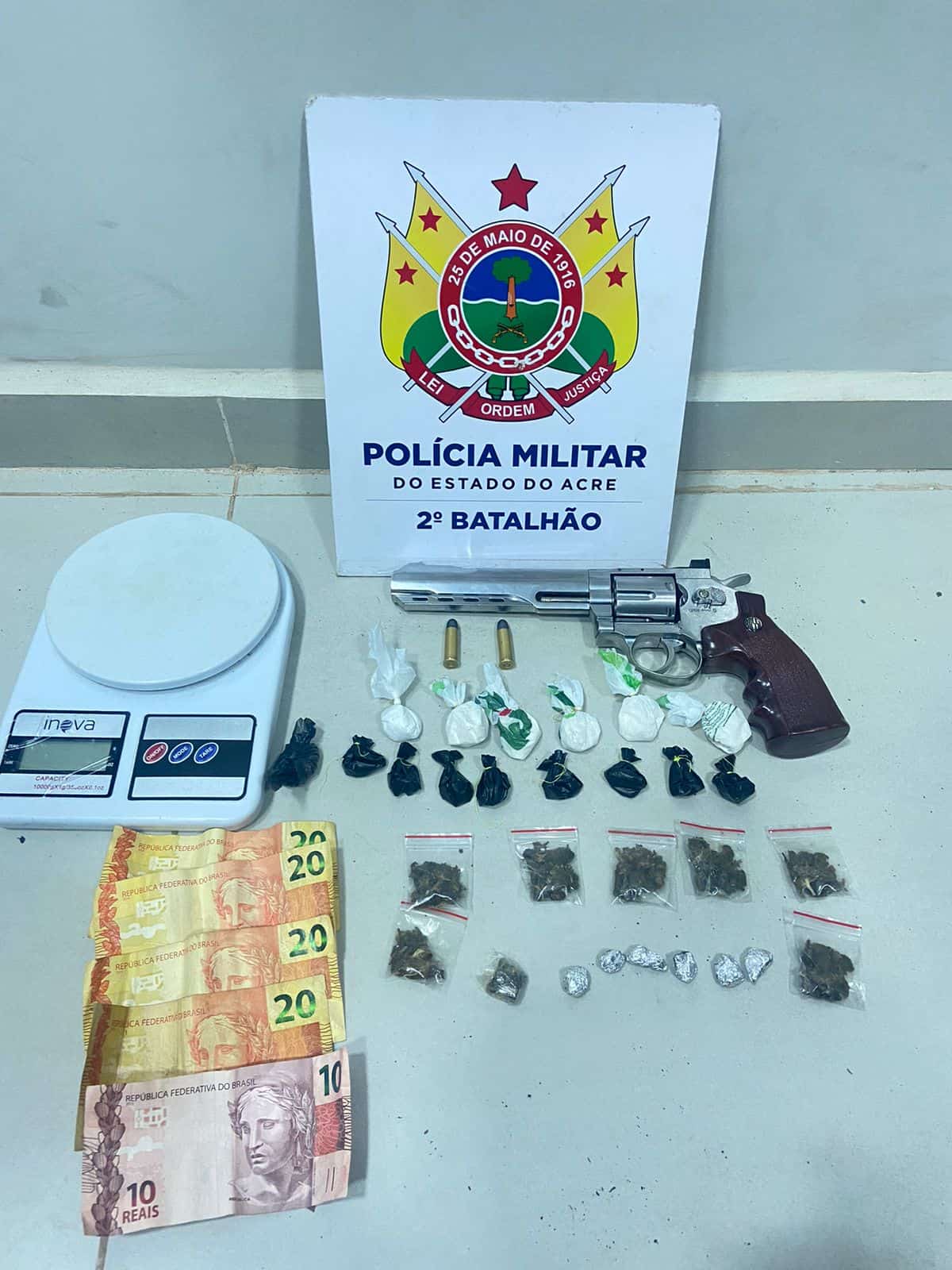 Militares realizavam um patrulhamento de rotina na madrugada desta quinta feira, e, por volta de 1:40 ao passarem por uma distribuidora, visualizaram um indivíduo em atitude suspeita. Quando o homem notou a presença da polícia, empreendeu fuga, mas os imbatíveis policiais conseguiram alcançá-lo e na abordagem encontraram na sua cintura uma pistola Taurus 9mm municiada. Questionado sobre a existência de outros ilícitos, o suspeito disse que tinha uma garruncha na sua casa. Os militares se dirigiram até a residência, e apreenderam uma escopeta municiada, além de drogas, dinheiro e uma balança de precisão. Ele recebeu voz de prisão e foi encaminhado para a delegacia de flagrantes.