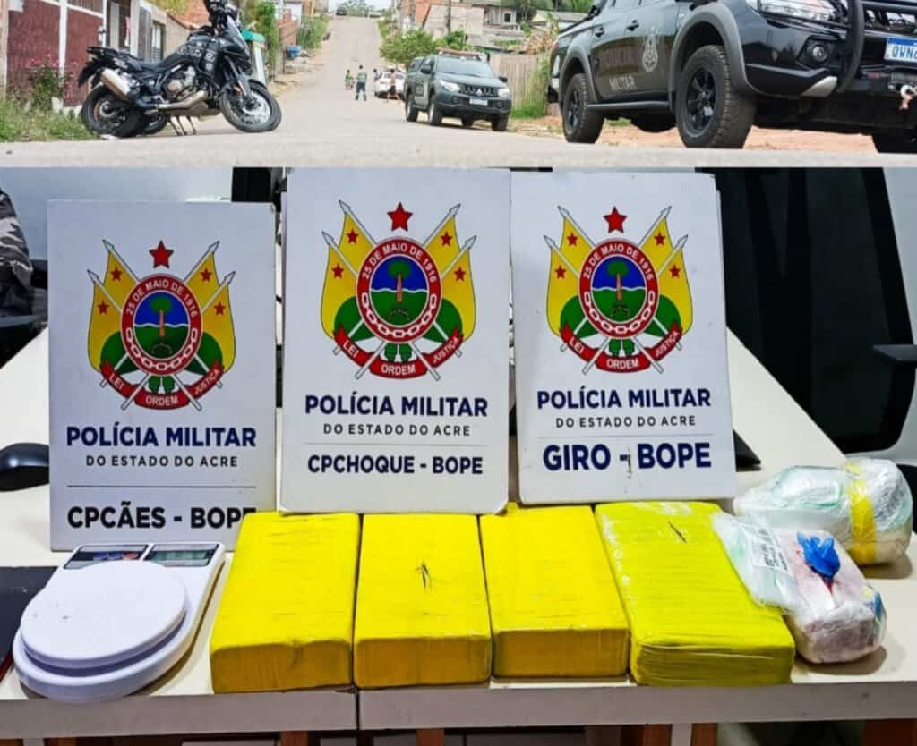 Policiais militares da Companhia de policiamento de choque (Cpchoque), Grupo de intervenção rápida e ostensiva (Giro) e da Companhia de policiamento com cães (Cpcães) apreenderam na tarde de terça-feira, 05, no bairro Vitória, 4.5 quilogramas de entorpecentes, após denúncia anônima.