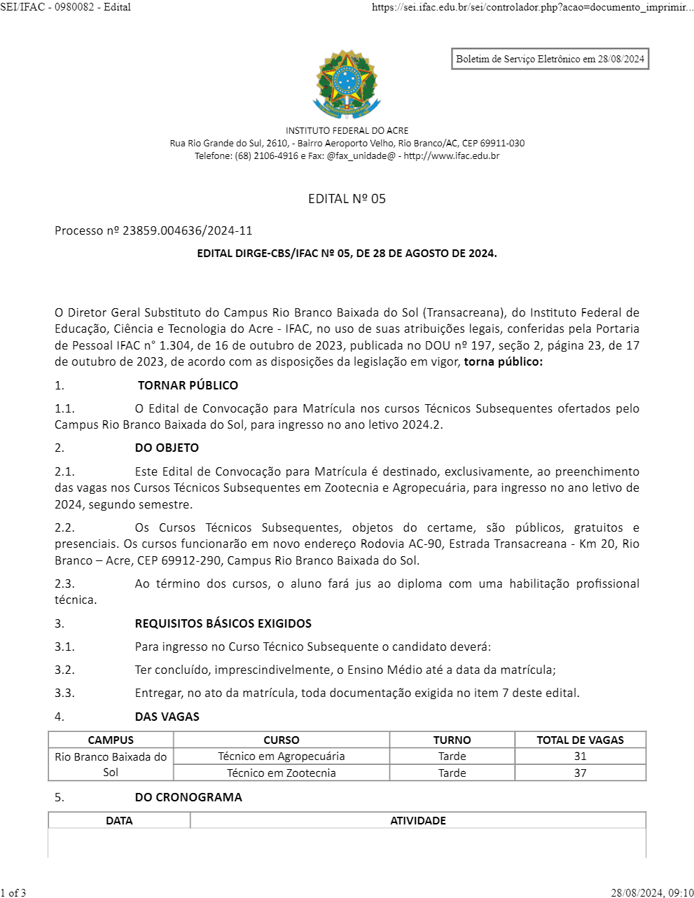 O Instituto Federal de Educação, Ciência e Tecnologia do Acre (Ifac) divulgou nesta semana abertura do processo de matrícula para os cursos técnicos subsequentes oferecidos pelo Campus Rio Branco Baixada do Sol (Transacreana). O edital tem como objetivo preencher vagas para os cursos de técnico em agropecuária e técnico em zootecnia, com início previsto para o segundo semestre de 2024.