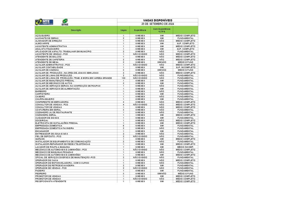 O Sistema Nacional de Emprego do Acre (Sine) oferece 208 vagas de emprego nesta quarta-feira, 25, para candidatos com nível fundamental e médio. Algumas dessas oportunidades são voltadas para pessoas com deficiência.