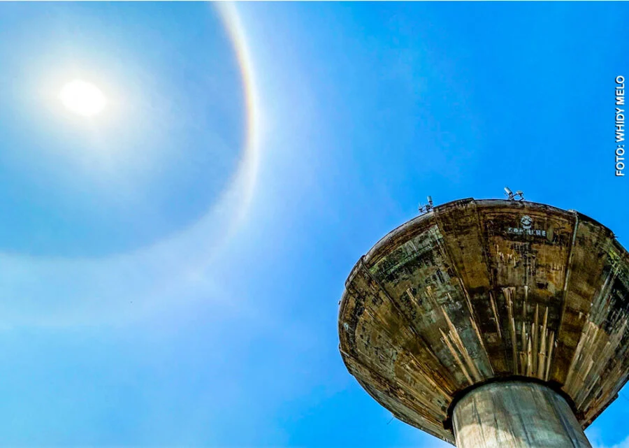 Além disso, um halo solar abrilhanta ainda mais a cor do céu. O fenômeno foi registrado pelo repórter do ac24horas Whidy Melo na manhã desta terça. O halo forma um anel com as cores do arco-íris ao redor do sol.