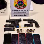 Na mesma operação, outros dois suspeitos tentaram escapar em direção a uma área de mata, mas foram interceptados. O segundo detido, Hudson Cauã da Silva, de 20 anos, conhecido como “Tranca Rua”, também possui histórico criminal por tráfico de drogas, furto qualificado e é investigado por homicídio qualificado. No momento da prisão, ele carregava uma pistola Taurus calibre .40, de uso restrito das forças de segurança, com numeração raspada e 15 munições.