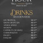 Na carta de bebidas, o público encontra Gin Tropical, Negroni, Aperol Spritz e Daiquiri por R$ 19,90, além da caipifruta de limão por R$ 14,90. O chopp Amstel 400ml sai por R$ 6,45, e o Brahma 400ml por R$ 7,90.