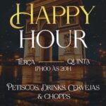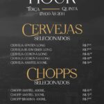 O happy hour também conta com uma seleção de cervejas long neck, incluindo Spaten, Budweiser, Corona e Amstel 600ml, para quem prefere uma bebida clássica e bem gelada.