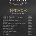 Entre as opções do cardápio, estão os pastéis de camarão, carne seca com catupiry e queijo (R$ 39,90 cada), além de pratos como filé trinchado com noisettes, picanha com batata rústica (R$ 59,90), bolinho de salmão (R$ 29,90) e o bolinho da chefe (R$ 26,90).