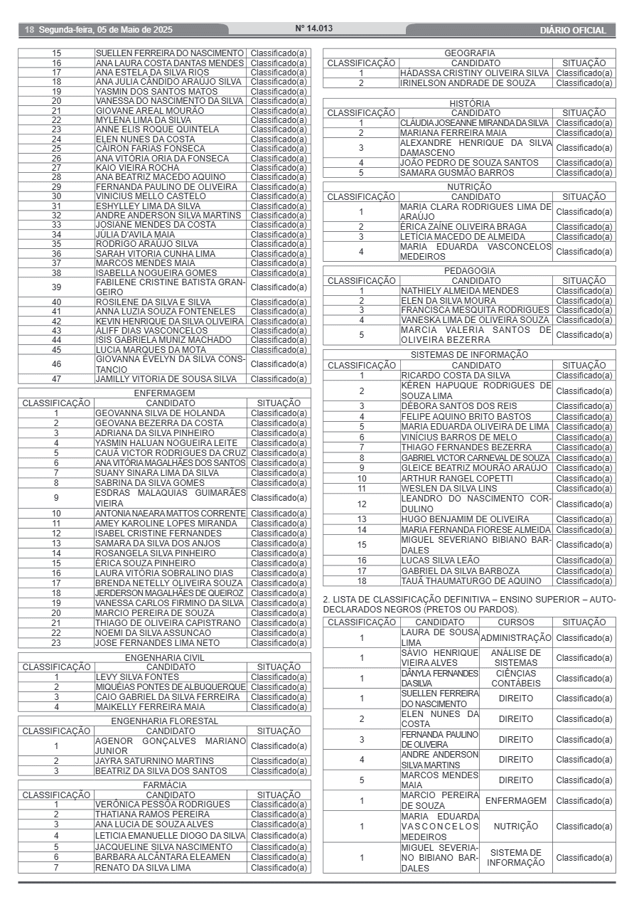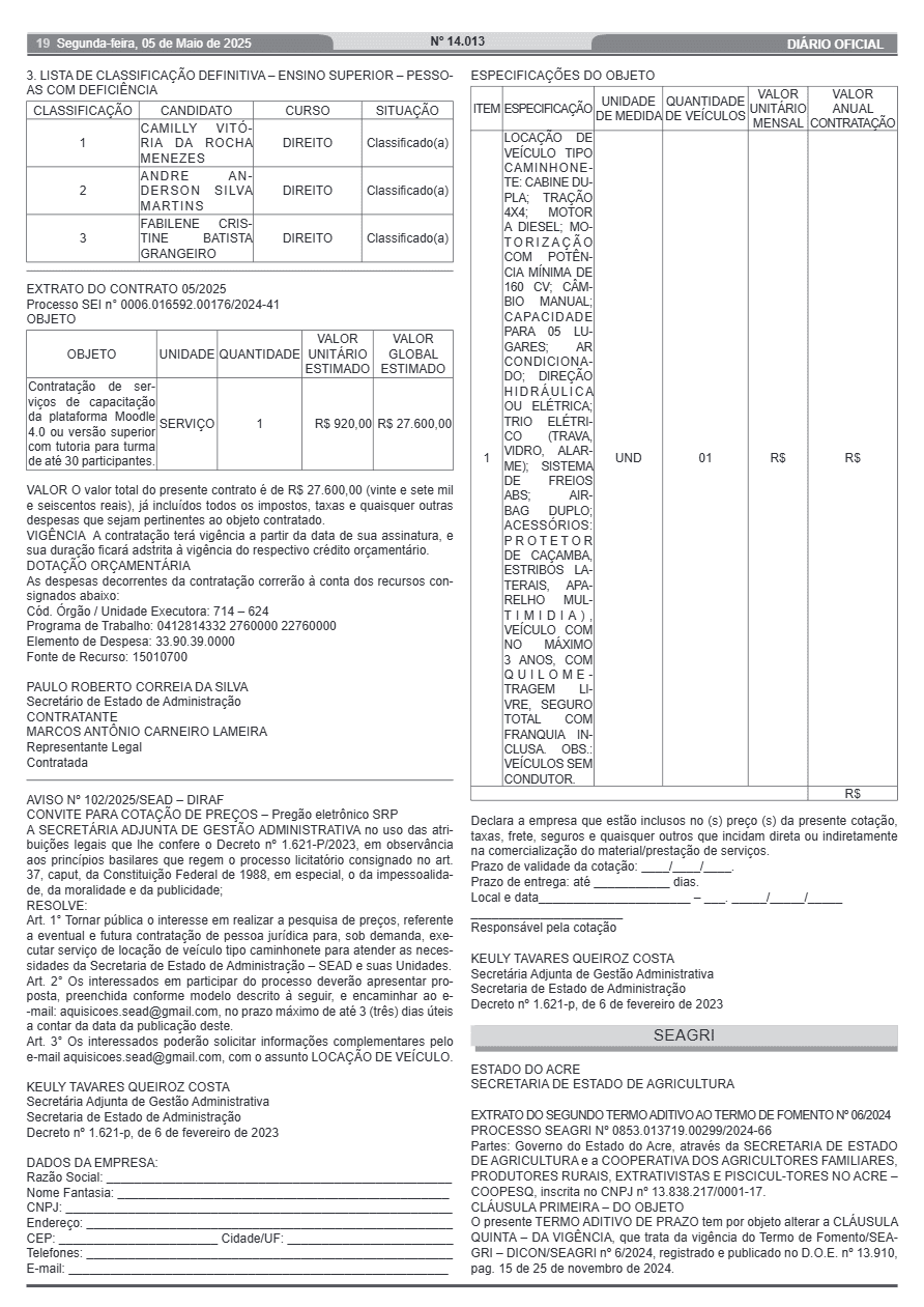 A Secretaria de Estado de Administração (Sead) do Acre divulgou nesta segunda-feira, 05, a lista definitiva de classificação do processo seletivo para estagiários do Governo do Estado.